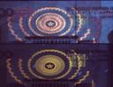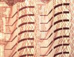 一種偽造方法是使用珠光油墨絲網(wǎng)印刷,有一定的光澤和閃光效果,但其線條粗糙,變色特征與真鈔有較明顯的區(qū)別,只有黃綠色珠光而不具備真鈔由綠到藍(lán)的變化(見下圖)。