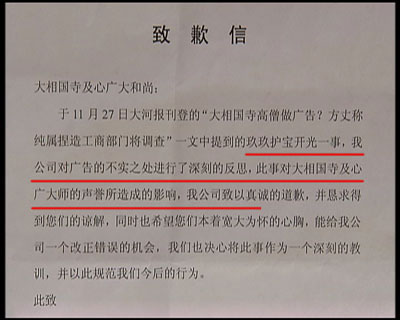 就在記者對玖玖理療褲的虛假廣告進(jìn)行調(diào)查時,河南開封大相國寺向記者出具了一份玖玖理療褲河南開封經(jīng)銷商,寫給大相國寺的一封致歉信,承認(rèn)自己假冒僧人的錯誤行為,從此廣告中來自大相國寺的高僧空智,就如同人間蒸發(fā),再也沒有出現(xiàn)過,取而代之的是佛教禪宗第36代傳人,但卻有著相同的名字和面孔——空智。