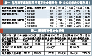 如,從35歲起開始為退休做準備,投資期限可達20年,為維持退休后20年每月2000元的生活水準,以10%的復利計算,您需要每月投資778元,維持其他水準生活水平的預計投資金額可參見表二。