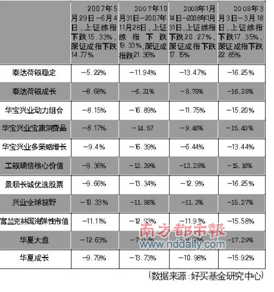 3月份以來,受到股市拖累的股票型基金,凈值下跌最少的也有10%,最多損失超過24%.然而同樣是凈值縮水,今年以來績優(yōu)與績差基金之間的差距居然高達30%,尋找抗跌的基金已經(jīng)成為今年基金投資的一個主要命題。好買基金研究中心樂嘉慶指出,從去年5月底至今,股市共經(jīng)歷了4個跌幅超過15%的階段。在4個階段中比較抗跌的基金表現(xiàn)出兩大特點,一是行業(yè)投資比較均衡的基金,另一個則是規(guī)模適中,倉位調(diào)整迅速的基金。