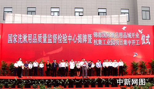 中新網(wǎng)邗江五月十八日電(記者 崔佳明 馬春陽)五月十八日,江蘇邗江在杭集鎮(zhèn)舉行國家洗漱用品質(zhì)量監(jiān)督檢驗中心揭牌暨錦都國際酒店用品城正式開業(yè)、杭集工業(yè)園項目集中開工儀式。中國輕工業(yè)聯(lián)合會綜合業(yè)務(wù)部副主任查長全、省質(zhì)監(jiān)局副局長張亞青、揚州副市長聞道才、邗江區(qū)委書記程裕松、區(qū)長韓方等領(lǐng)導(dǎo)出席,活動由區(qū)長韓方主持。