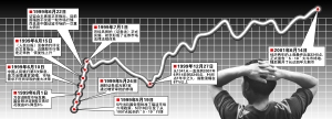 199年的5·19前夕,深滬股市再次探底,上證綜指創(chuàng)出1047.83點(diǎn)的階段新低,許多市場(chǎng)中人都為大盤可能擊穿1000點(diǎn)而憂慮。當(dāng)年5月19日,在沒有任何利好刺激的情況下,在中信國安、廈門信達(dá)等網(wǎng)絡(luò)科技股的帶動(dòng)下兩市大盤走出放量上漲的行情,并連續(xù)4日大幅上漲,漲幅超過20%,就這樣,一輪井噴式的上漲行情就在投資者毫無準(zhǔn)備下展開了。