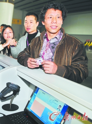 來自湖南邵陽、在中山橫欖鎮(zhèn)某建筑工地做泥水工的唐結(jié)元成了今年春運廣州實名制火車票查驗進站的第一人。昨天下午2時不到,他扛著行李來到琶洲展館候乘點驗證臺前。工作人員先將機票二維碼放在掃描器處掃了一下,電腦屏幕顯出L7688次車票的信息,還有唐結(jié)元的姓名和身份證號碼。接著她又將唐結(jié)元的身份證放在閱讀器上,電腦屏幕又顯示出唐結(jié)元的個人信息。接著,屏幕顯示“通過”字樣。工作人員隨即在車票上蓋上“廣鐵集團廣州火車站實名驗訖”的章。整個過程不超過20秒。據(jù)悉,對于一代證和其他十幾種的購票證件都需要人工驗票。