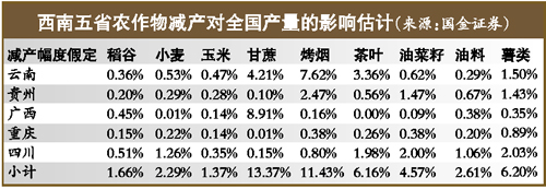 國金證券預(yù)測,西南五省甘蔗、水稻、烤煙產(chǎn)量在全國占比分別達(dá)78.19%、21.79%、53%,如果旱情持續(xù),勢必導(dǎo)致上述農(nóng)作物大幅減產(chǎn)。供求關(guān)系的改變,可能將推高相關(guān)農(nóng)產(chǎn)品價格。
