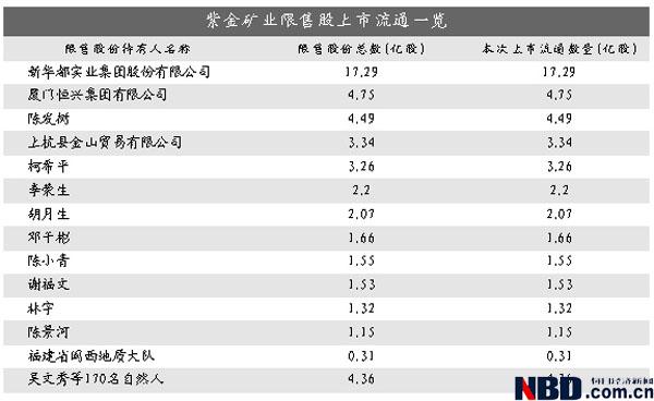 此外,廈門恒興實業(yè)有限公司和上杭縣金山貿(mào)易有限公司分別持有4.75億股和3.34億股。陳發(fā)樹、柯希平、李榮生、胡月生、鄧干彬、陳小青、謝福文、林宇以及陳景河9位自然人解禁股數(shù)也超過了1億股,其中陳發(fā)樹解禁數(shù)量最多,達(dá)到4.49億股。這些自然人股東的賬面收益最多的高達(dá)44億元,最少的也有11.27億元。