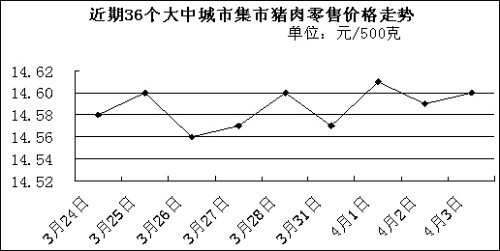 中新網(wǎng)4月7日電 國家發(fā)改委網(wǎng)站消息稱,據(jù)國家發(fā)展改革委價格監(jiān)測中心監(jiān)測,上周(3.31-4.4,下同)全國36個大中城市集市豬肉(精瘦肉)平均零售價格每500克為14.59元,比前一周(3.24-3.28,下同)上漲0.07%。