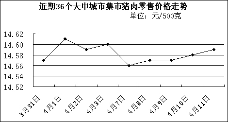 中新網4月14日電 中國國家發(fā)改委網站消息,據發(fā)改委價格監(jiān)測中心監(jiān)測,上周(4.7-4.11,下同)全國36個大中城市集市豬肉(精瘦肉)平均零售價格每500克為14.57元,比前一周(3.31-4.4,下同)下降0.14%。