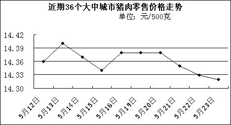 中新網(wǎng)5月26日電 中國國家發(fā)改委網(wǎng)站消息,據(jù)國家發(fā)改委價(jià)格監(jiān)測中心監(jiān)測,上周(5月19日—5月23日)36個(gè)大中城市豬肉(精瘦肉)平均零售價(jià)格每500克為14.35元,比前一周(5月12日—5月16日)下降0.14%。