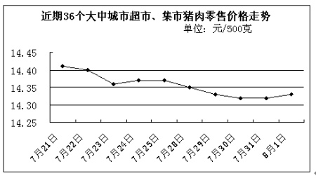 中新網(wǎng)8月4日電 國家發(fā)改委網(wǎng)站消息稱,據(jù)國家發(fā)展改革委價格監(jiān)測中心監(jiān)測,上周(7月28日-8月1日)全國36個大中城市超市、集市豬肉(精瘦肉)平均零售價格每500克為14.33元,比前一周(7月21日-7月25日,下同)下降0.35%。