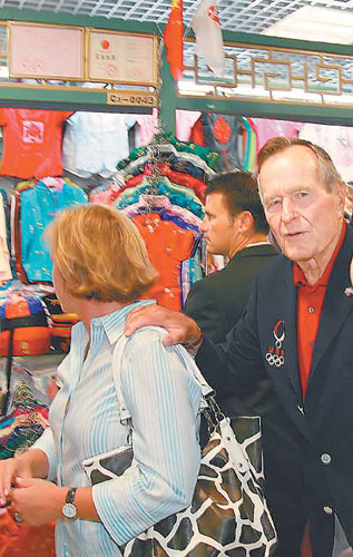 這邊羅格夫人還未離開,美國前總統(tǒng)老布什和女兒也一起來逛秀水街了。看見這么多人熱情地圍上來,老布什很興奮,向圍觀的人群招著手,便直奔三樓絲綢一條街。