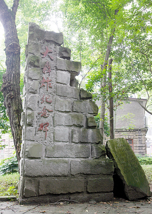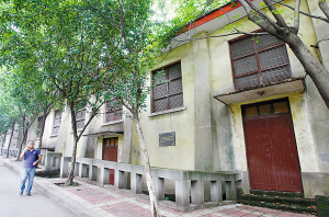 重慶大學(xué)A區(qū)后校門樹(shù)陰掩映,鳥(niǎo)鳴啾啾中,一棟黃色墻體、灰色瓦頂?shù)睦辖ㄖP立。旁邊碑刻顯示,“七七抗戰(zhàn)大禮堂”已歷經(jīng)72年風(fēng)雨。