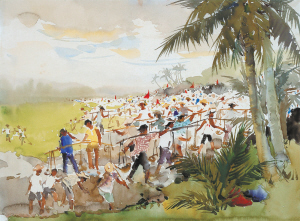 我鉆進(jìn)椰子林作畫,其熱無比,連油色的錫管都燙手。忘了在何處,林中小蟲特多,咬得緊,穿著長褲、長袖襯衣,且將袖口和衣領(lǐng)都包得嚴(yán)嚴(yán)實(shí)實(shí),但回到宿店才知滿身都是紅塊塊,奇癢難忍,店主頗可憐我,說:氓!氓!我聽不懂廣東話,她用筆寫,原來是蚊。