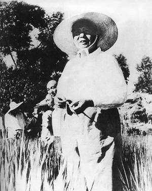 這是毛澤東一生第一次,也是唯一一次來到成都。23年前即遵義會議后,他曾進入四川,帶領(lǐng)中央紅軍飛奪瀘定橋,然后進阿壩高原,爬雪山,過草地,歷盡艱險,而今他站在成都西門遠眺隱約可見的雪山,可能不僅想到了杜甫的著名詩句,更多想到的應(yīng)是自己曾經(jīng)出沒那里的曲折經(jīng)歷。