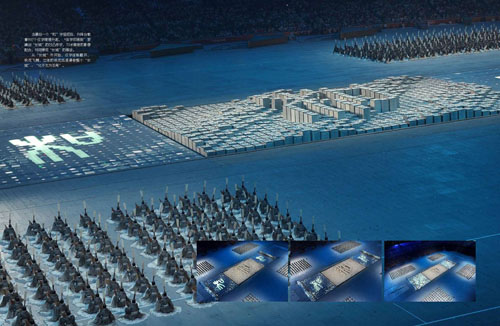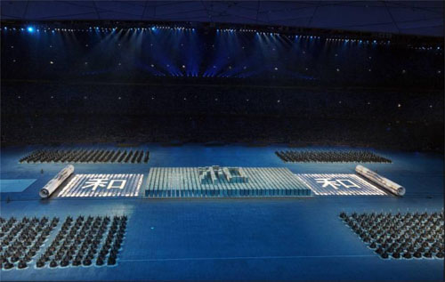 2008年北京奧運會開幕式上,幾百名演員扮演的活字印刷字模通過不斷變幻,用大篆、小篆、楷書三種不同字體展現了同一個漢字——“和”。