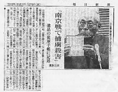 12月8日出版的日本《每日新聞》,以《“攻打南京的時(shí)候曾經(jīng)殺害過(guò)俘虜”——一名日軍士兵從軍日記中的記述》為題,刊登了記者結(jié)城薫的一篇消息,并附上了說(shuō)明為“牧野久仁博正在介紹父親的從軍手記”的照片。