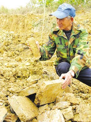 在施工現(xiàn)場(chǎng),包括一座漢墓在內(nèi),至少有兩座墓葬在強(qiáng)大的挖掘機(jī)的“發(fā)掘”下,已經(jīng)慘不忍睹,只剩少許破碎的青磚,讓人依稀感到這里曾是座古墓。所幸的是,發(fā)現(xiàn)大青磚的那座六朝墓還沒有被掘毀,從挖掘機(jī)挖開的斷面上看,青磚雖沒有六朝大墓那么大,同時(shí)因還沒有進(jìn)行正式發(fā)掘,尚不知該墓的具體規(guī)模。但目前已經(jīng)暴露的墓磚較大,尤其還發(fā)現(xiàn)了上下寬度不同的梯形磚,因此顯然也不是平民之墓。據(jù)專家推測(cè),這里很有可能是那座六朝大墓主人的親屬之墓。