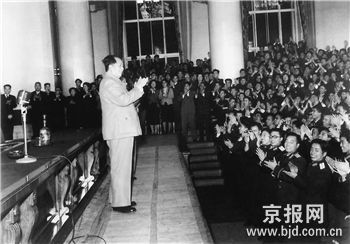 接著,毛主席給大家談了當(dāng)時(shí)的國(guó)際形勢(shì),他首先指出,十月社會(huì)主義革命是人類歷史上一個(gè)轉(zhuǎn)折點(diǎn),國(guó)際共產(chǎn)主義運(yùn)動(dòng)的團(tuán)結(jié)和蘇聯(lián)兩顆人造地球衛(wèi)星上了天,這兩件事標(biāo)志了兩大陣營(yíng)力量對(duì)比的新的轉(zhuǎn)折點(diǎn)……十月革命產(chǎn)生了新世界,經(jīng)過(guò)40年,新世界的力量已經(jīng)超過(guò)了舊世界……現(xiàn)在不是西風(fēng)壓倒東風(fēng),而是東風(fēng)壓倒西風(fēng)。毛主席說(shuō)到這里,大廳里又響起了熱烈的掌聲。