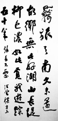 那天,他乘酒興一口氣給我留下兩幅字。其中一幅是這么寫的:“羈旅天南久未還,故鄉(xiāng)無此好湖山;長堤柳色濃如此,覓我游蹤五十年!鳖H具唐風(fēng)的七言絕句,流露出他對昆明那種強烈而纏綿的感情。