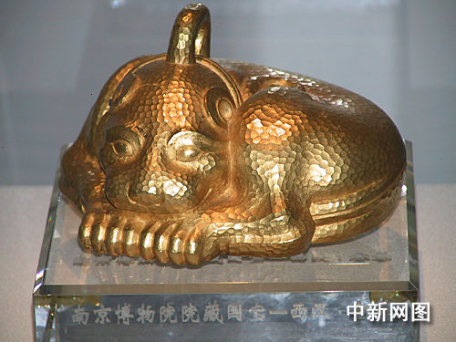 記者隔著玻璃窗看到,一只脖套項(xiàng)圈的金豹身覆鱗片,半蹲于座,鱗片在燈光映照下閃爍,光彩灼人,整座展品有著強(qiáng)烈的立體感。“這叫金獸,古時(shí)作保財(cái)鎮(zhèn)庫之用,迄今為止仍是中國出土文物中最大最重的金器”,南京市博物院院長龔良如是說。