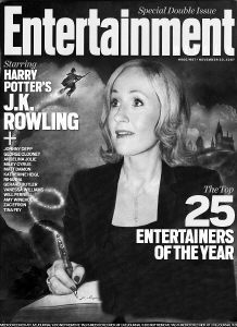 《娛樂周刊》按照一個(gè)班級(jí)里可能會(huì)出現(xiàn)的5種人來為娛樂界的名人定位,他們分別是天賦異稟、班中小丑、風(fēng)云達(dá)人、八卦之星和致詞代表。今年推出《哈利.波特》完結(jié)篇的羅琳沒被歸于其中任何一類,被選為“年度娛樂人物”。雜志認(rèn)為,羅琳完成了不可能完成的任務(wù),在電玩和在線游戲充斥、一切講究短小輕薄的年代,她施展魔法,讓數(shù)億大小孩抱著厚厚的印刷書籍愛不釋手,雜志如此評(píng)價(jià)說:“《哈利.波特》已賣出了4億冊(cè),并且拍成了有史以來最賺錢的電影系列片,羅琳讓人們圍著她老式的印刷大書團(tuán)團(tuán)轉(zhuǎn),好像這就是地球上最火熱的新娛樂手段似的!