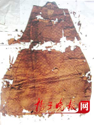 照片中,一堆已經(jīng)損壞的咖啡色織物,殘缺不全、圖案斷續(xù)、毫無光澤,就好像枯萎的花朵一般。如果不是專家介紹,沒有人會(huì)將它們和明代皇帝、云錦聯(lián)系在一起。這件“中單”出土于萬歷帝棺內(nèi)中部中間,剛剛出土?xí)r,是金光閃閃的,但是在與空氣接觸后,迅速氧化、褪色。通過云錦研究所的復(fù)制,記者見識(shí)了“紅八寶四合云紋綢交領(lǐng)中單”當(dāng)年的風(fēng)采,“中單”無袖,里與面之間夾了一層薄棉絮,凸于表面的紋樣是象征“物華天寶”的八寶紋。據(jù)介紹,此件“中單”類似于現(xiàn)代的襯衫,“小衣之外、大衣之中”,尺寸一般小于袞服、龍袍一寸,長四尺。