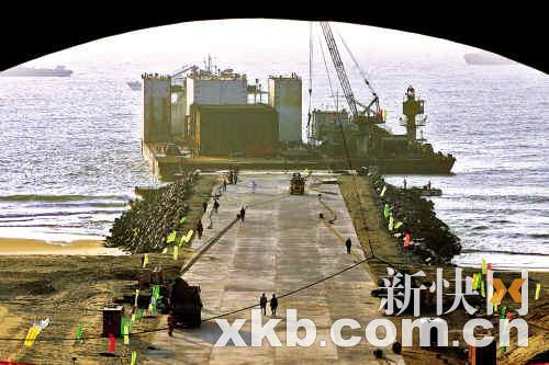 記者在碼頭上看到,這里還堆放著8塊6.15×2.3米的2厘米厚鋼板,這就是讓“南海I號(hào)”登陸的跳板了。此時(shí)船上的工作人員也開始用吊機(jī)將一個(gè)個(gè)氣囊放在沉箱的兩邊,準(zhǔn)備在沉箱底部放入氣囊。7時(shí)45分,岸上的拉移工程人員到達(dá)現(xiàn)場,將電線接入設(shè)備中并鋪設(shè)鋼索。