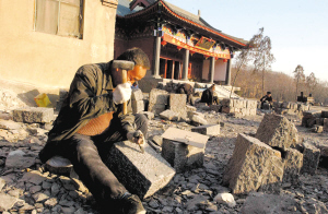 進(jìn)入山門內(nèi),一座壯觀的金頂大雄寶殿坐北朝南,院內(nèi)一片繁忙景象,50多位石匠正在用老式的打石方式,一塊一塊擊打著青石,切好的石塊被抬到大雄寶殿一東一西在建的兩座建筑上。