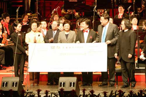 全場的最高潮無疑是3家主辦方?jīng)Q定將門票收入所得共103.9720萬元票款的支票交到中華慈善總會代表的手中,委托其捐獻給受雨雪災(zāi)害最嚴(yán)重的湖南、貴州、廣西等省區(qū)市時,觀看演出的觀眾紛紛起立,掌聲如雷鳴般鼓動。