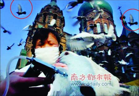 [提要] 現(xiàn)在是“大家來找碴”時間,06CCTV年度十大新聞圖片《藏羚羊生命中的十道難關(guān)——鐵路關(guān)》已被成功鑒定為假照片。今天推出的這張是2005年首屆華賽金獎作品《廣場鴿接種禽流感疫苗》。作者否認(rèn)曾修改照片,但當(dāng)年華賽評委蔣鐸認(rèn)為兩只鴿子是PS無疑。接下來讓我們一起等待專家調(diào)查。