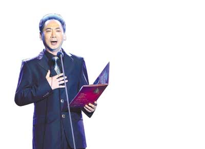 晚會由著名表演藝術(shù)家瞿弦和與武警文工團合唱團分別獻上不同版本的《周總理,你在哪里》,奏響開篇大幕。74歲高齡的殷之光再度攜手著名鋼琴家劉詩昆,獻上配樂詩朗誦《周總理辦公室的燈光》,而周恩來扮演者劉勁(右圖)與鄧穎超扮演者黃薇這對老搭檔繼電視連續(xù)劇《周總理在重慶》后再次合作,為觀眾送上周總理與鄧穎超的通信錄對白節(jié)選《從西花廳海棠憶起》。動情處兩人潸然淚下,下臺前,兩人對著背景板上的周恩來夫婦深鞠一躬,場面十分感人。歌唱家丁毅的《你是這樣的人》將晚會推向高潮。記者張學軍 記者 蘇冠名/攝