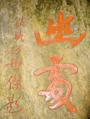 隨后,記者來到鼎湖山,在上慶云寺的山路上,如愿找到了“曲徑通幽處”幾個(gè)題刻碑石。但只有“幽處”的碑石上清晰地題寫著“鐵城方世杰”(見上圖)。