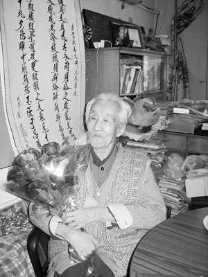 周汝昌手捧鮮花,滿面笑容。接過(guò)劉文莉送來(lái)的一對(duì)紫檀木鎮(zhèn)紙時(shí),周老笑著說(shuō):“謝謝,謝謝!”