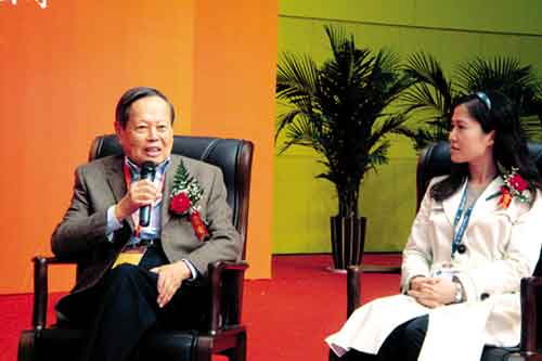 談到對(duì)臺(tái)下不少中小學(xué)生讀者的期許,楊振寧說:“今天早上我在香港看電視,節(jié)目中提到梁?jiǎn)⒊砟暾f過的一句話‘無負(fù)今日’,今天是一個(gè)大時(shí)代,希望每個(gè)年輕人不要辜負(fù)今天所給的嶄新機(jī)會(huì)。每個(gè)年輕人如果想一下他的祖父輩、父親輩時(shí)祖國(guó)所處的狀態(tài),再比較一下今天的狀態(tài),一定能理解‘無負(fù)今日’四個(gè)字的深意!” (記者鄧瓊攝影)