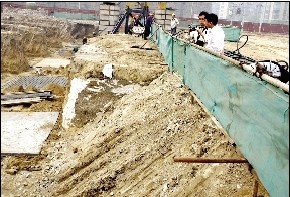 事發(fā)時(shí),該工地正在進(jìn)行地基部分施工,在地基槽東側(cè)和南側(cè)2米多深的地方挖出大量三合土和青石磚。文保人員介紹,這些都是比較典型的明清時(shí)期墓葬標(biāo)識(shí),初步勘察墓葬有10米見方,深3米多。在工地內(nèi)施工的工人稱,數(shù)天前該工地中心位置也曾挖出過兩具棺木,并且出土過一塊方形的青石板。文保人員懷疑可能是一塊墓志銘,但由于施工破壞,找到青石板比較困難。
