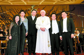 隨后,教皇走上舞臺與余隆和幾位歌唱家握手,并發(fā)表了5分鐘的演講,教皇表示昨晚的演出是一份稱心如意的禮物,“事實上這個音樂會在某種程度上讓我們接觸到中國社會活潑輕快的現(xiàn)實,在這群出色的藝術家身上,我們可以看到他們所代表的偉大中國文化和音樂傳統(tǒng),他們的演繹也幫助我們更了解一個民族的歷史”。在講話最后,教皇竟然出人意料的用中文說出“感謝大家并祝愿大家一切順利”,并主動邀請幾位藝術家一起合影,這也是教皇回贈給中國藝術家的禮物。