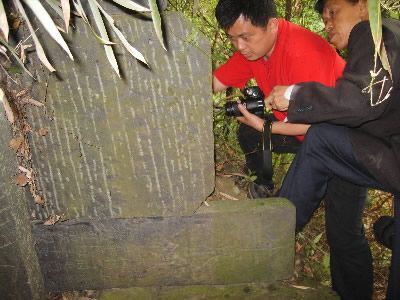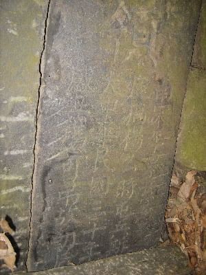 在李爹爹的帶領下,考古人員一行前往樹木蒼郁的牛皋嶺。山路上滿是雜亂的樹草,路面十分崎嶇而又濕滑。在一處名叫解放堰的小水庫邊,考古人員發(fā)現(xiàn)水庫的石堰是由很多塊青石板筑成,其中有一塊長約2米、寬約0.2米的石條上刻有“牛皋嶺”三個大字,大字下面刻有“南宋牛皋岳家軍之……”、“庭摛楊幺時屯兵斯……”、“大中華民國三十年……”等字樣,字跡有些模糊,但部分仍能清晰辨認。據(jù)介紹,該石碑是1941年國民黨軍官歐震派人從“牛皋墓”那里抬來的,并在上面刻下了“牛皋嶺”的字樣。1949年解放的時候,村里修建水庫缺少石料,就將這塊石碑用來修石堰了,之前在抗日戰(zhàn)爭時期,“牛皋墓”也遭到很大程度的破壞。