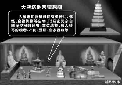 。兾鳎┦∩缈圃鹤诮萄芯克L(zhǎng)王亞榮日前介紹,和法門(mén)寺寶塔下有地宮一樣,大雁塔下也藏有千年地宮。據(jù)推測(cè),玄奘自印度取經(jīng)歸來(lái)后,所帶回的珍寶有很多藏在大雁塔下的地宮里。