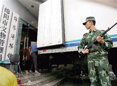 昨天,在荷槍實(shí)彈的武警押運(yùn)下,包括漢代說(shuō)唱俑、搖錢(qián)樹(shù)等國(guó)寶在內(nèi)的6091件文物從綿陽(yáng)博物館緊急轉(zhuǎn)移到廣漢三星堆遺址博物館庫(kù)房存放。因擔(dān)心唐家山堰塞湖可能潰壩導(dǎo)致洪水毀壞文物,綿陽(yáng)博物館決定緊急轉(zhuǎn)移2.5萬(wàn)件文物,當(dāng)天轉(zhuǎn)移了第一批。