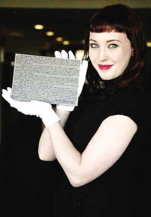 這次拍賣會(huì)拍賣了13位知名作家在卡片上創(chuàng)作的短故事,共籌得4.715萬英鎊。除羅琳外,其他作家包括2007年諾貝爾文學(xué)獎(jiǎng)得主、英國(guó)女作家多麗斯·萊辛以及英國(guó)“布克獎(jiǎng)”得主、加拿大作家瑪格麗特·阿特伍德。萊辛的作品拍得3000英鎊,英國(guó)劇作家湯姆·斯托帕德的作品拍得4000英鎊。
