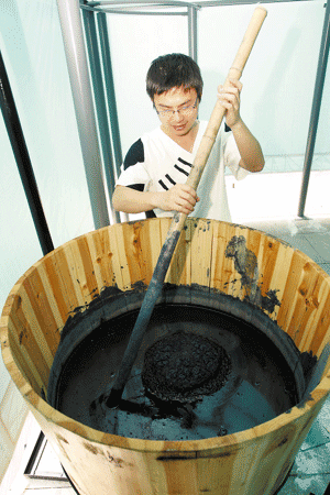 工作人員正在攪拌靛青。本報(bào)記者 李震宇 攝