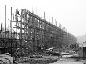6月30日,記者在“唐山地震遺址紀(jì)念公園”的工程現(xiàn)場(chǎng)看到,盡管剛下過大雨,地上一片泥濘,但滿載沙石、物料的大貨車照舊進(jìn)進(jìn)出出,壓路機(jī)、大鏟車、小叉車也是隆隆作響。一排新建的鋼筋混凝土骨架像一道巨大的屏障,將整個(gè)工地截成南北兩塊。在它的西側(cè),已經(jīng)保存了32年的原唐山機(jī)車車輛廠鑄鋼車間地震遺址,在一層霧氣的籠罩中依舊桀驁地挺立在那里。