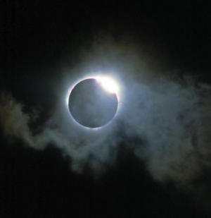 其次是日冕,當貝利珠消失,月亮把太陽安全擋住,立即可以在黑太陽圓面的邊緣看到了一圈紅色的色球?qū)樱袝r還能看到從色球?qū)訃姲l(fā)出的白色日珥;隨即色球?qū)右脖辉铝琳谧。綍r看不到的太陽外層大氣———日冕就露出了“尊容”,它那呈現(xiàn)放射開頭的珍珠色光芒,好像給太陽戴上了一頂帽子。此時,在黑暗的天空中,往往還能看到金星和木星等行星,以及其他明亮的恒星。