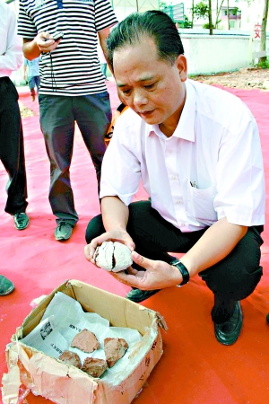 據(jù)河源市文廣新局副局長(zhǎng)、“恐龍蛋”鑒別專家、河源市博物館館長(zhǎng)黃東介紹,8月6日上午,他往河源市恐龍博物館新建工地檢查工程進(jìn)度時(shí),負(fù)責(zé)該工地施工的管理員歐齊云拿出幾塊剛剛從地下挖出來(lái)的圓形殘缺的“石頭”給他鑒別,看看是否屬于恐龍蛋化石。經(jīng)辨別,歐齊云手中的“石頭”正是“恐龍蛋”。