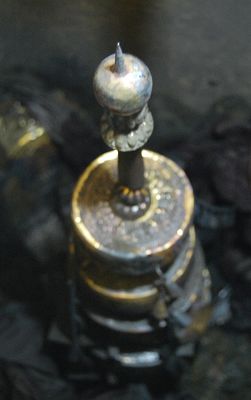 塔剎露出來(lái)后,曾主持過(guò)雷峰塔地宮考古的專家黎毓馨說(shuō),這是一個(gè)銀鎏金的七寶阿育王塔。但南京的工藝美術(shù)大師王殿祥提出了質(zhì)疑,他認(rèn)為這尊鎏金塔王是銅鎏金,而不是銀鎏金。奚三彩說(shuō),這尊塔表面鎏了金是肯定沒(méi)問(wèn)題的,但里面是銅的還是銀的,目前還不能肯定,要等它完全被取出來(lái)以后,拿到科學(xué)儀器上檢驗(yàn)一下才知道。