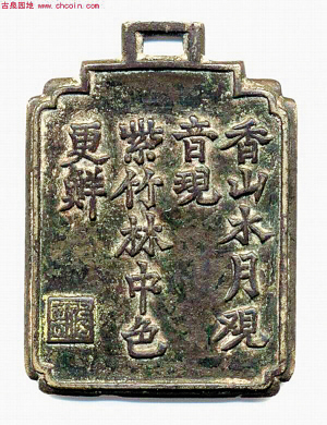 “香山水月觀音現(xiàn),紫竹林中色更鮮!弊蛉眨粔K刻有無(wú)名詩(shī)句的清代古銅牌現(xiàn)身渝北區(qū)。對(duì)此牌,收藏界有兩種說(shuō)法。一說(shuō),此牌是“名妓號(hào)牌”;二說(shuō),是當(dāng)時(shí)某地下組織的“會(huì)員證”。