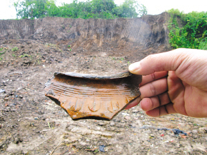 聞?dòng)嵹s來(lái)的南京市博物館考古隊(duì)員在挖塌的斷壁泥土中隨便撥弄,就找到幾塊碎陶片!澳憧,這塊是黑陶、這塊是夾砂紅陶,從陶片看,這個(gè)器皿不小,上面還有不是很規(guī)則的戳印紋。”記者仔細(xì)一看,上面刻的紋飾非常精美。一位考古專(zhuān)家說(shuō),此次經(jīng)過(guò)考古勘探,郭家山坑商周時(shí)期古文化遺址長(zhǎng)220米,寬120米左右,面積達(dá)到2.3萬(wàn)平方米。從斷面上可見(jiàn)大量紅燒土層及紅陶、灰陶片,其中可辨器有罐、鬲、鼎等。據(jù)悉,考古人員在這個(gè)文化遺址上一共探測(cè)到了8個(gè)文化層,最底層則是3000多年前的商周文化層。