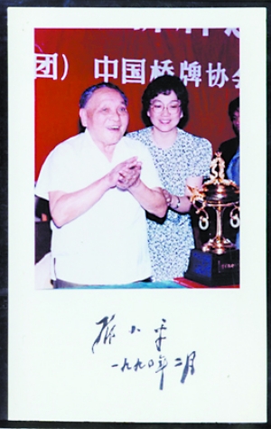 在這次拍照之前,還有一件事令我難忘。有一次,我抓拍了一張小平發(fā)獎時的照片,老人微昂著頭,一臉慈祥的笑意,鼓掌向大家問好。我將照片拿給同志們看,大家說不錯,很傳神。于是我萌發(fā)了一個想法:如可能,請小平同志為照片簽個名。我把這想法告訴橋協(xié)陳澤蘭同志,她讓我洗好照片,有機會試試。