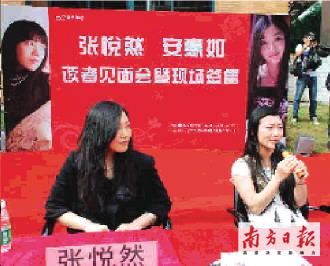 22日中午,“80后”作家張悅?cè)粩y同安意如帶著她們的作品《鯉:嫉妒》以及《惜春紀(jì)》來到廣州大學(xué)城進(jìn)行讀者見面會暨作品簽售!懊琅骷摇钡念^銜吸引了不少廣東大學(xué)生,當(dāng)天中午,簽售會現(xiàn)場火爆,使得原計(jì)劃12點(diǎn)半結(jié)束的簽售會延遲到了1點(diǎn)半。簽售會結(jié)束后,張悅?cè)慌c安意如接受了本報(bào)記者的采訪。