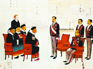 應(yīng)該看到,李鴻章東渡議和之日,正是日本國內(nèi)主戰(zhàn)氣焰繼續(xù)高漲之時。日本輿論大肆宣揚,對中國的割讓土地“唯欲其大”,賠償軍費“唯欲其多”,甚至聲稱“必須有瓜分(中國)四百余州的決心”。在日本軍隊內(nèi)部,主戰(zhàn)氣焰更為濃烈,力主非占領(lǐng)北京不可言和。在一些日本將領(lǐng)公開發(fā)表的詩作中,多有“燕京從是幾行程”、“何時輕騎入燕京”等詩句,以進(jìn)行鼓氣和煽動。馬關(guān)雙方開議后,李鴻章首先提出停戰(zhàn)問題。伊藤博文、陸奧宗光早知清廷最迫切期望的是停戰(zhàn),便故意提出日軍應(yīng)占領(lǐng)天津、大沽、山海關(guān)三地,管理天津山海關(guān)間之鐵路等苛刻條件,以迫使中國方面打消停戰(zhàn)的念頭。日本輿論也鼓動乘勝攻占北京,有署名詩作寫道:
