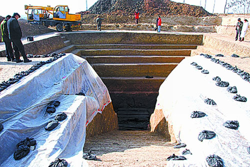 最大古墓發(fā)掘現(xiàn)場,厚厚的土層已被分成了7級收縮臺階。據(jù)介紹,這個大墓地下部分深達7米多,外開口占地面積達52平方米,墓道面積達22平方米。記者發(fā)現(xiàn),大墓最后3級臺階下,土層由黃變赭紅。專家稱,赭紅色土層其實不是真正的土層,而是尚未完全形成的紅砂巖,遇水比較軟,但風干后就成了風化石。因此可以想象,當年修墓時,棺槨下部的空間是由人工開鑿出來的,四壁上仍能看到明顯的開鑿痕跡。